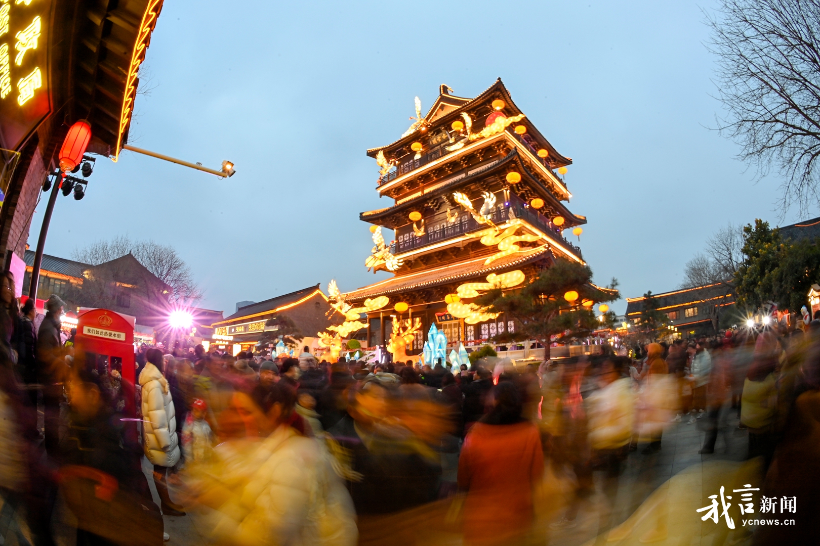 灯光与古韵水街相映成趣,亭台楼阁在灯火映衬下更显雅致。几位身着汉服的姑娘提着刚买的小鱼灯,在“瑞马迎春”灯组前合影,光影流转间,衣袂飘飘,仿佛穿越了时光。