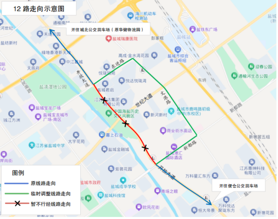 原线路走向:城北公交回车场(原华健物流园)、开放大道、盐丰快速通道、开放大道、大仓路、花园路、便仓公交回车场。