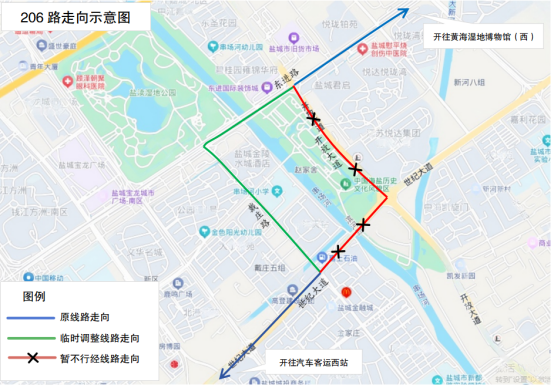 原线路走向:黄海湿地博物馆(西)、范公路、五星路、运河路、东进路、开放大道、世纪大道、神州路、海洋路、开创路、新都路、珍时路、盐盘路、汽车客运西站。