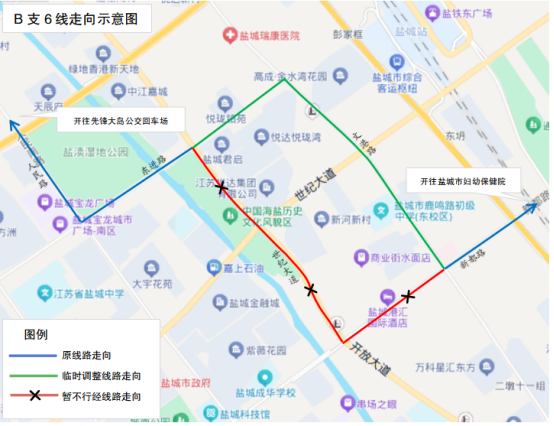 调整后走向:黄海湿地博物馆(西)、范公路、五星路、运河路、东进路、戴庄路、世纪大道、神州路、海洋路、开创路、新都路、珍时路、盐盘路、汽车客运西站。
