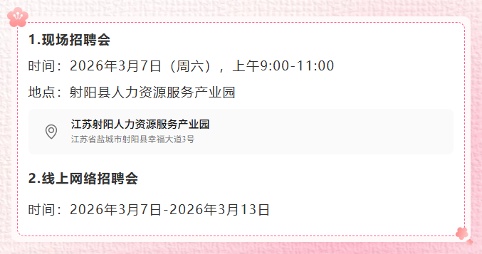 新春启序,万象焕新,第116个“三八”国际劳动妇女节即将来临。为精准对接射阳县企业高质量发展用人需求,切实为女性群体搭建便捷高效的就业对接平台,3月7日起,射阳县将举办“春风送岗‘职’为她来”主题招聘会。