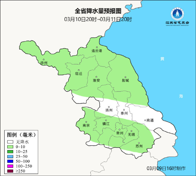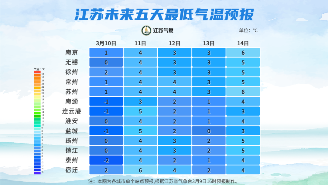 3月9日20时至3月10日20时,淮北北部地区晴转多云到阴,其他地区晴到多云。最高温度:本省东南部地区11℃左右,其他地区12~13℃;最低温度:本省东部地区-2℃左右,其他地区0~1℃。