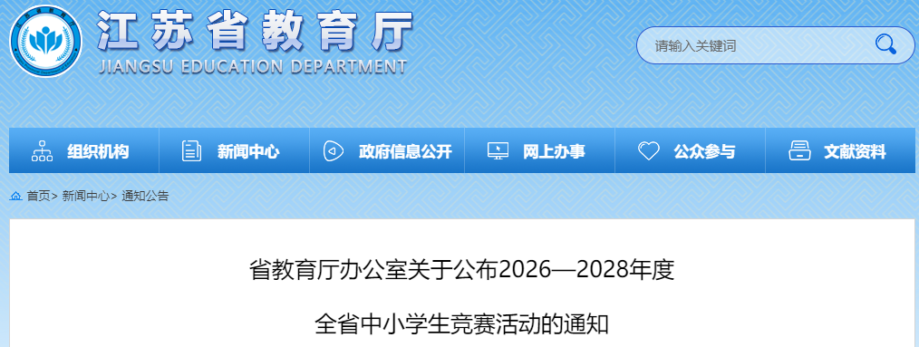3月25日,江苏省教育厅网站发布《省教育厅办公室关于公布2026—2028年度全省中小学生竞赛活动的通知》。