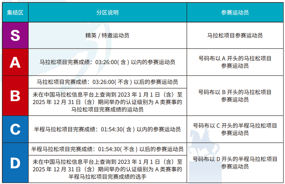 起跑秩序:按号段分区集结,文明入场,严禁跨区抢跑。
