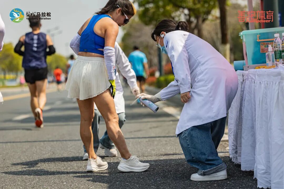 而在盐城奥体中心赛后恢复区,数十个冰水沐足池一字排开,清澈的水中浮着碎冰,帮助跑者快速缓解腿部酸痛。完赛选手们坐在池边,把疲惫的双脚泡进水里,脸上写满惬意。组委会还在一旁设置了专业的拉伸放松区,十几位康复师为完赛运动员提供一对一拉伸服务。