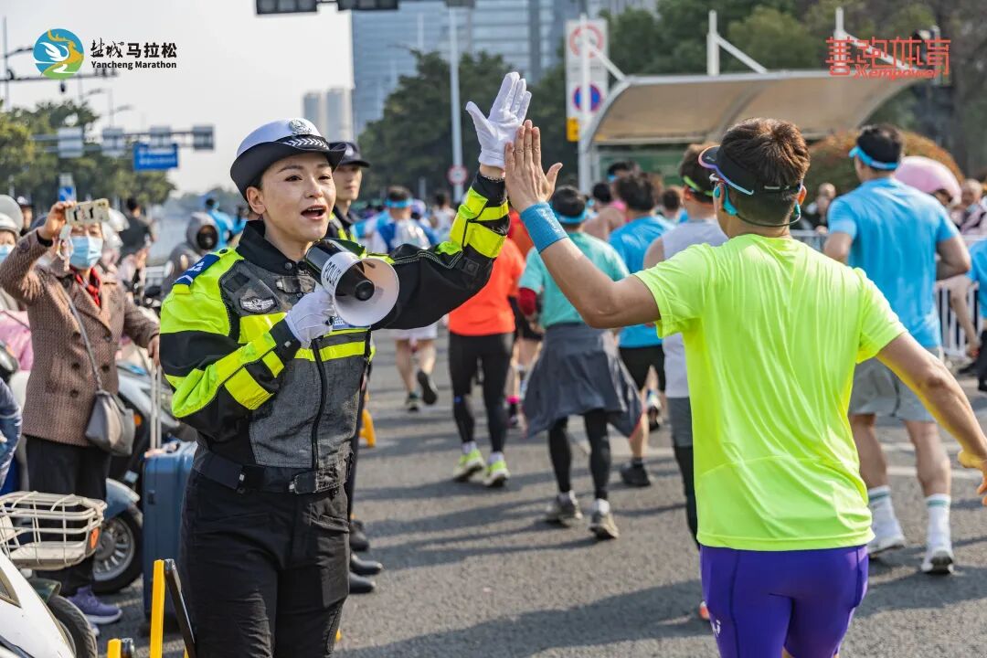 “加油!加油!”“坚持就是胜利!”“好样的!”……沿线市民自发驻足,挥舞旗帜、高声呐喊,此起彼伏的欢呼声,让每一位跑者都感受到盐城这座城市的热情。