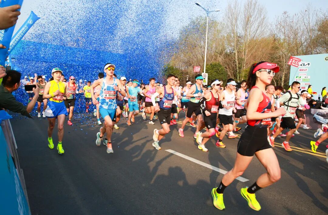 赛道起点,礼炮齐鸣,金色礼花漫天绽放。跑友们迎着和煦春风,迈开矫健步伐,踏上风光旖旎的赛道。专业选手身姿矫健,步步铿锵,用汗水叩问潜能;业余跑者虽汗流浃背,却以坚持诠释热爱。白发老者与青春少年并肩而行,年龄不同,奔跑的初心却一样炽热。