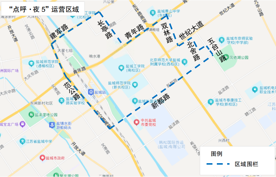 综合市民需求和前期运营分析,此次升级对“点呼·夜5”运营范围进行了优化调整,新增覆盖工学院建军路校区,优化后,“点呼·夜5”运营区域将覆盖工学院建军路校区、工学院希望大道校区、师范学院新长校区、盐城高铁枢纽和城东宝龙商场等重点点位。