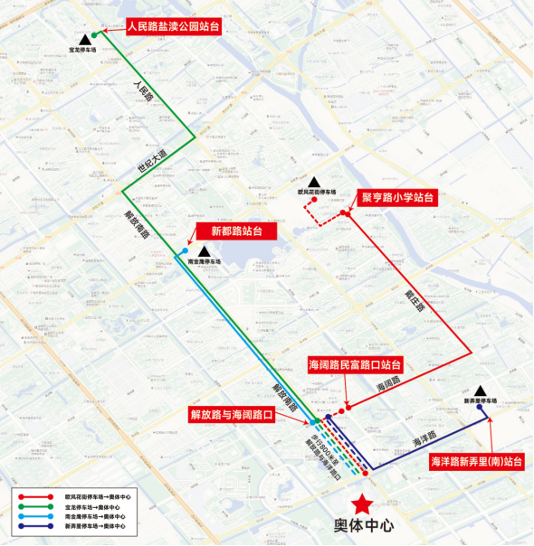 散场上车站台:海洋路解放路口站台(奥体中心东北门出口位置)