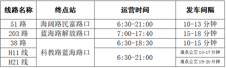 B1线:5分钟一班,上车站台:解放路沿线各站台,下车站台:解放路与海阔路口,下车后步行800米至解放路与海洋路口(检票口位置)。