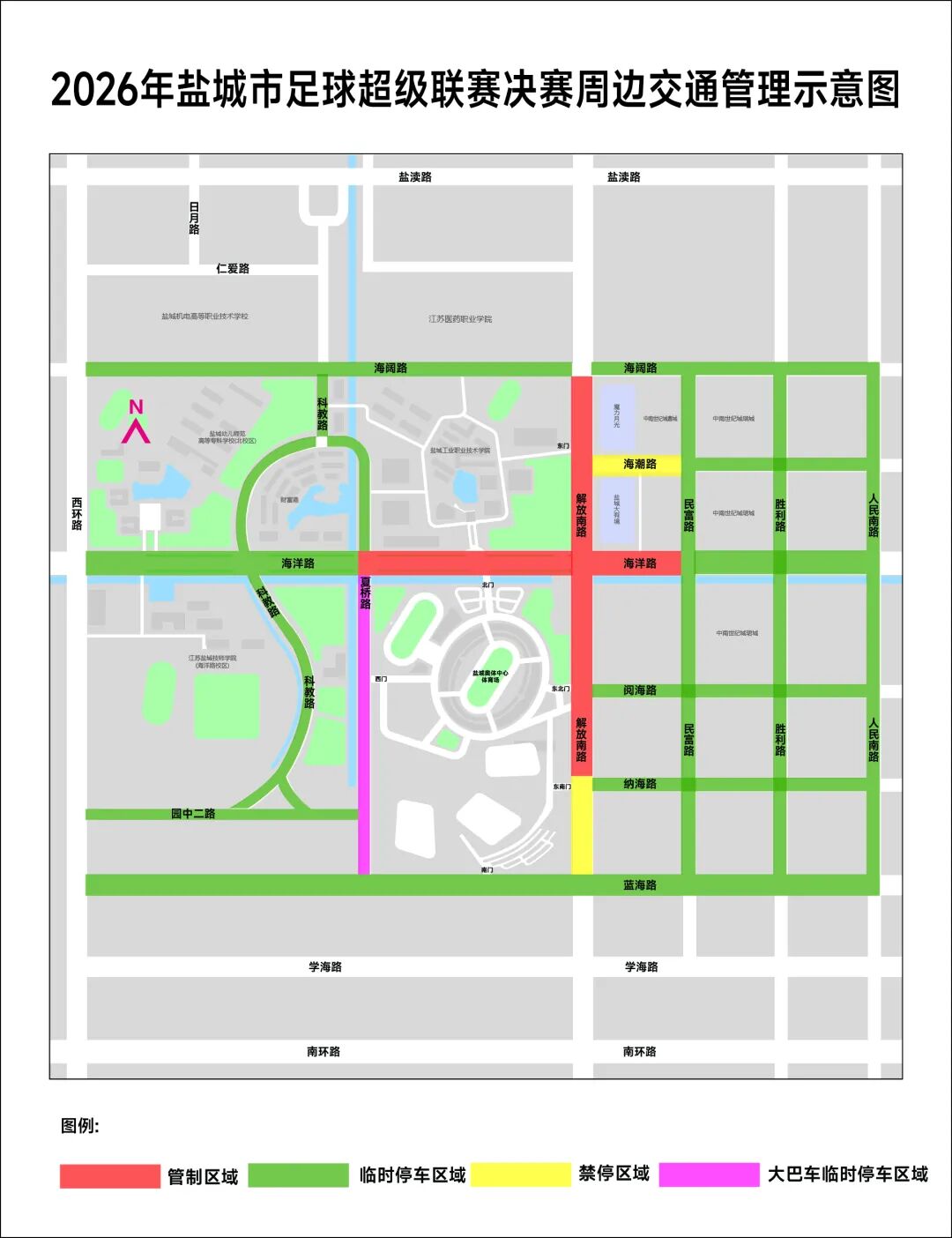 2026年盐城市足球超级联赛决赛(东台VS建湖)将于4月4日15:00—17:00在盐城奥体中心体育场举办,届时约有3.3万名观众观看比赛,为确保比赛期间交通安全、畅通、和谐、有序,盐城交警倡议观众朋友们“绿色出行”。