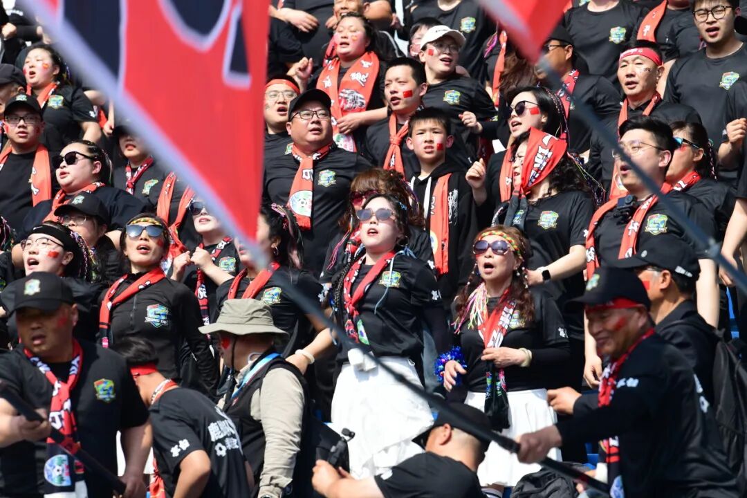 4月4日的市奥体中心热情澎湃,旗帜挥舞、呐喊震天。当天有30105名观众来到现场为绿茵健儿们加油助威。