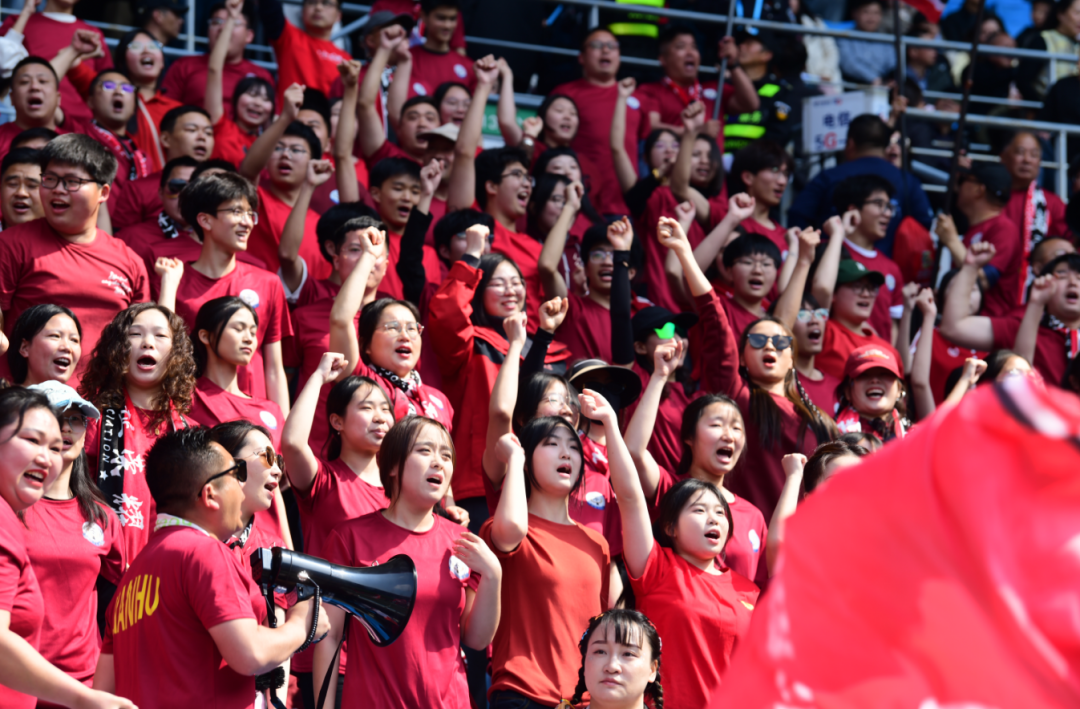 东台球迷徐先生站在后排,五岁的儿子坐在他肩膀上,跟着人群一起欢呼。“今天正好是清明假期,带孩子来感受这份足球热情,也算是一场特别的‘春游’。”他希望这份热血与欢乐,能成为孩子童年里一段难忘的回忆。