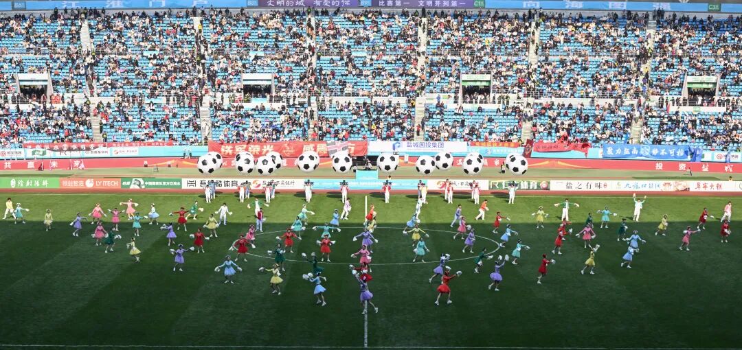中场休息和颁奖仪式前,分别上演了精彩的文体表演。“绿茵逐梦·向海图强”篇章用动感表演,诠释盐城开放包容、勇立潮头的城市精神;“万众一心·爱我中华”篇章以优美舞姿,彰显全市众志成城、昂扬向上的精神风貌。当《我的祖国》旋律响起,全场齐声合唱,共同抒发对祖国的热爱和对盐城足球的美好祝愿。