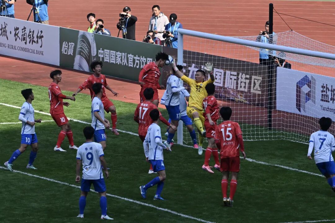 15时整,随着裁判一声哨响,比赛正式开始。双方球员迅速进入状态,攻防转换间拼抢激烈。上半场第8分钟,东台队获得角球机会,22号球员艾孜买提·木合塔尔江门前抢点破门,先拔头筹。第33分钟,东台队31号球员朱晓航在禁区前沿搓射得手,将比分扩大为2:0。第38分钟,十人应战的建湖队顽强作战,利用门前混战由10号球员颜禹扳回一城。下半场第53分钟,东台队攻势不减,5号球员王俊飞射门得手。第77分钟,东台队11号球员钟宇航利用角球机会再次得分,将全场比分锁定为4:1。