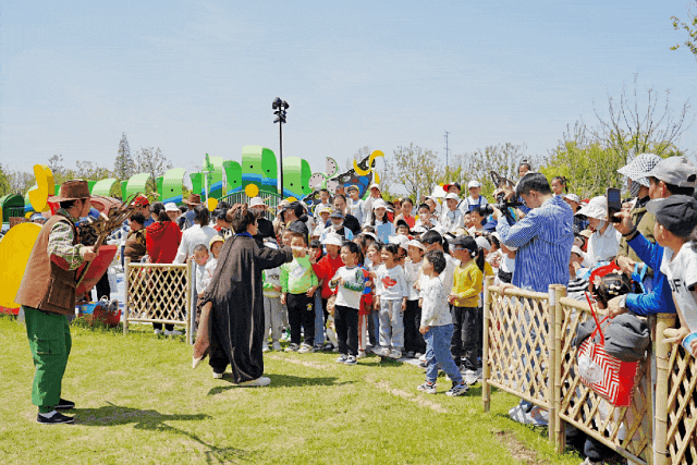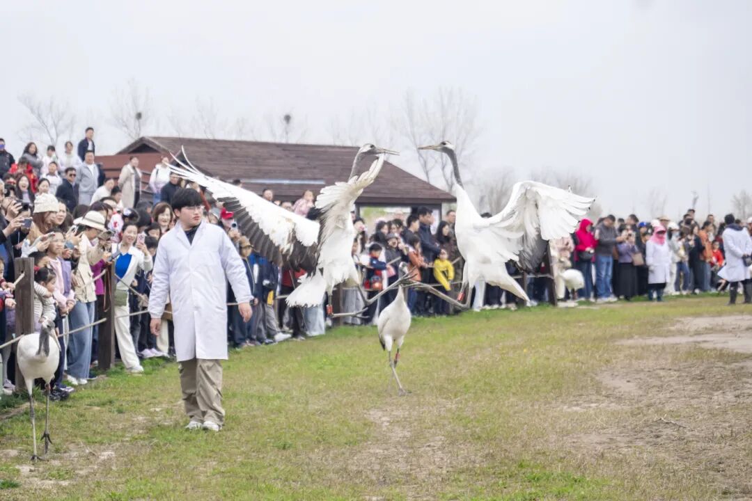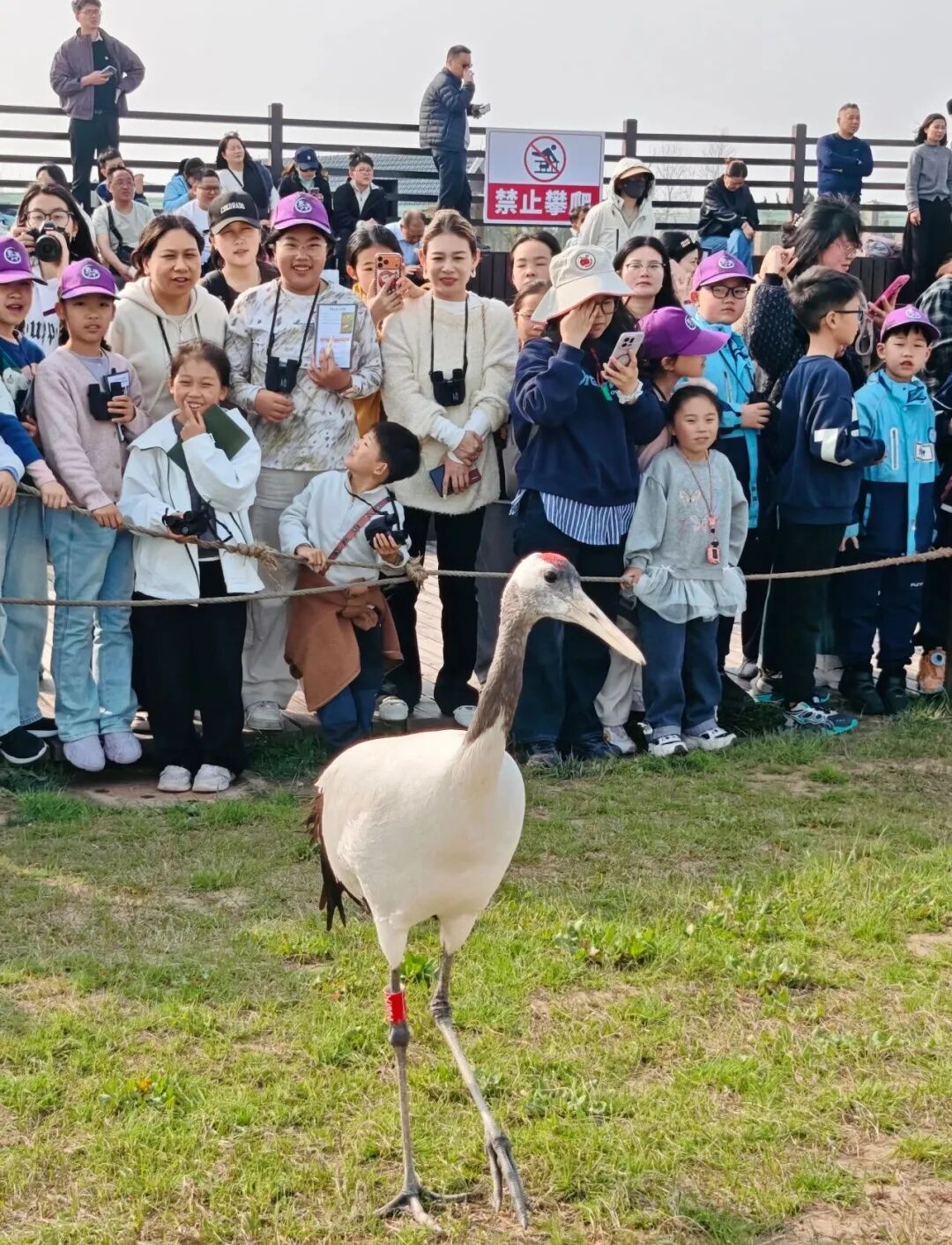 丹顶鹤湿地生态旅游区,游客们看着丹顶鹤野化放飞训练,纷纷举起手机定格瞬间,小鹤课堂、免费拼豆、制作青团等活动吸引游人无数。