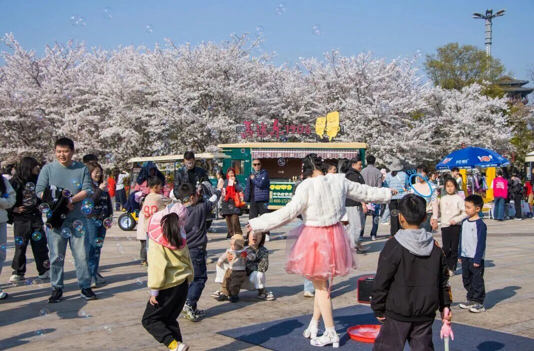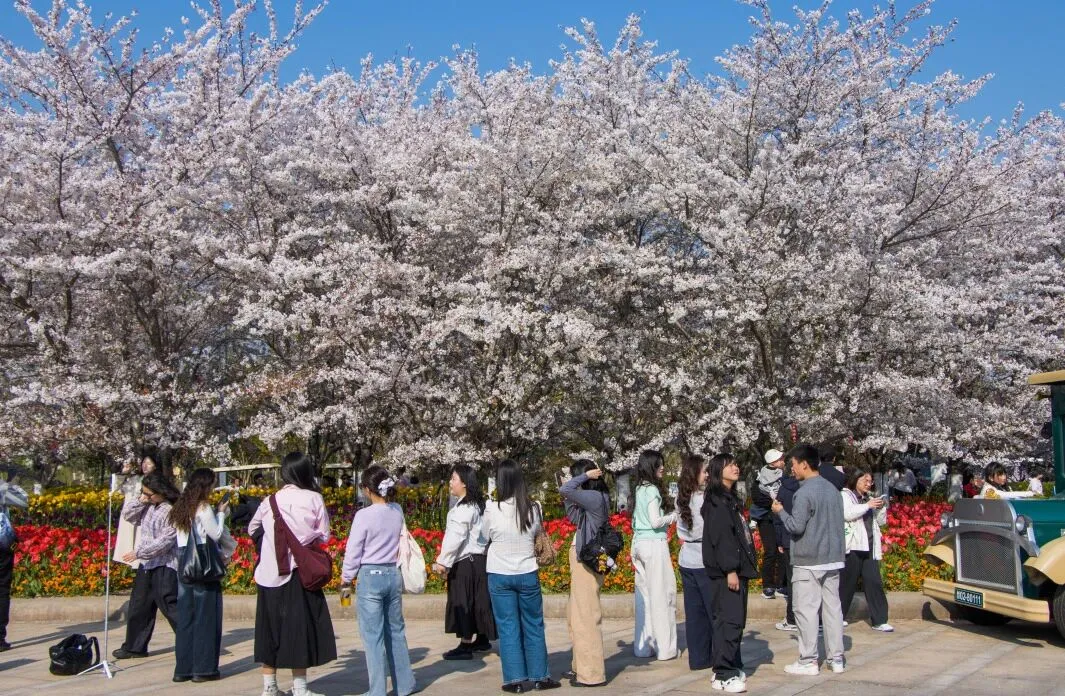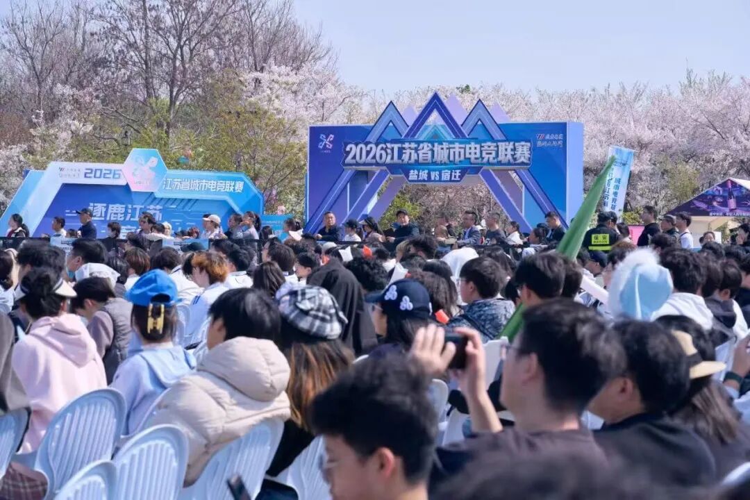 大洋湾内,六万余株樱花粉白相间,灿若云霞。每一处樱花都是最佳机位,游客抬头是漫天浪漫,树下是攒动身影。2026江苏省城市电竞联赛在此热血收官,樱花大草坪主会场座位全满,樱花树下见证了滚烫的青春热望。