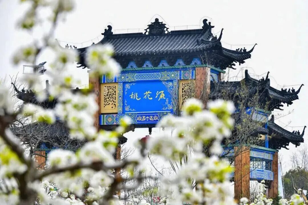 龙冈桃花源中,桃花、梨花竞放,花海里人潮涌动。