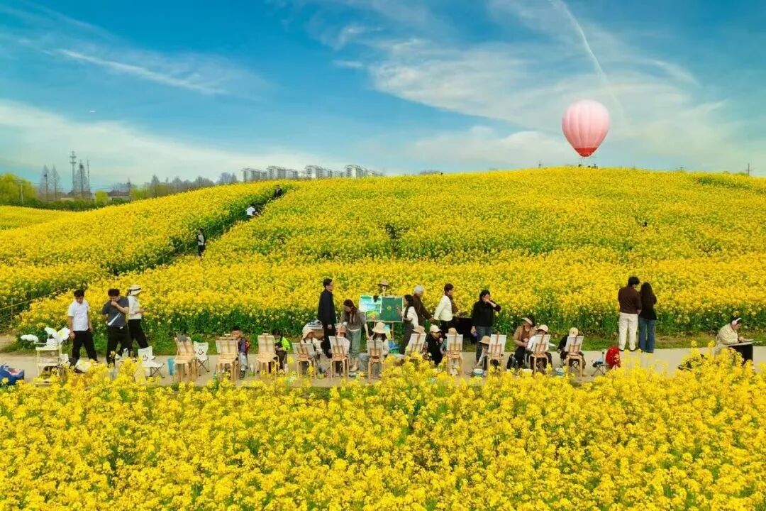 西溪天仙缘的花田里,油菜花在阳光下泛着金光,孩子们用画笔记录下烂漫春色。