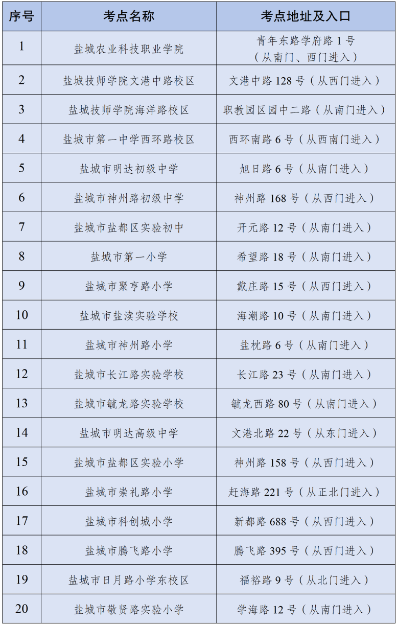 盐城考区笔试设了20个考点,各考点区位、线路及考场分布图等详情,可登录盐城市人事考试服务平台-准考证打印http://jsychrss.yancheng.gov.cn/col/col23513/index.html栏目页面下载、查阅。