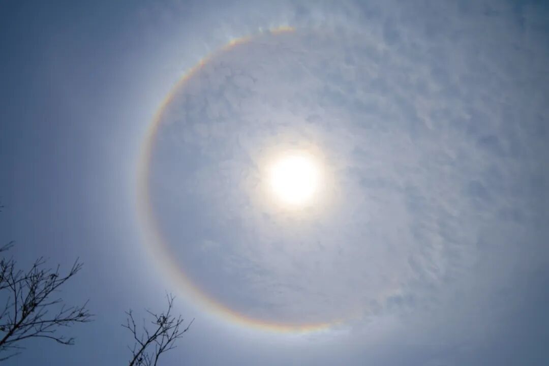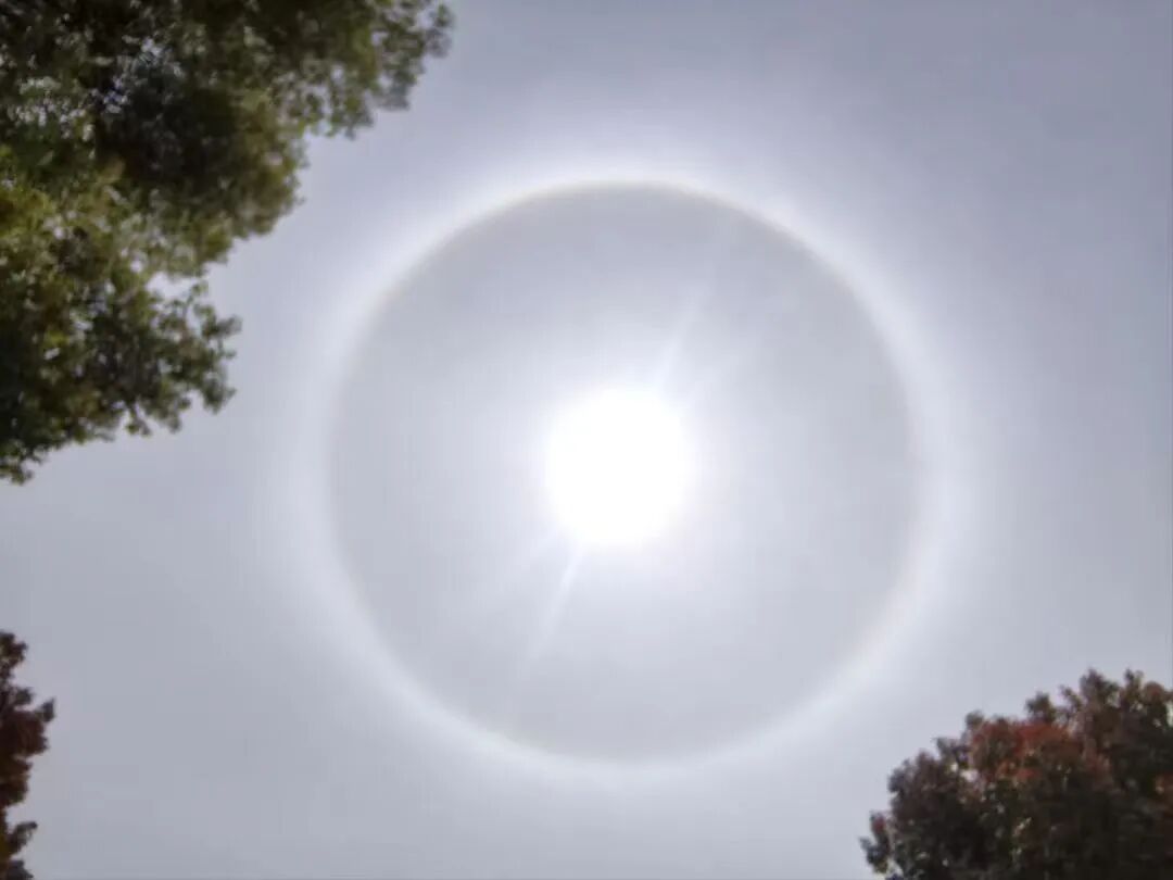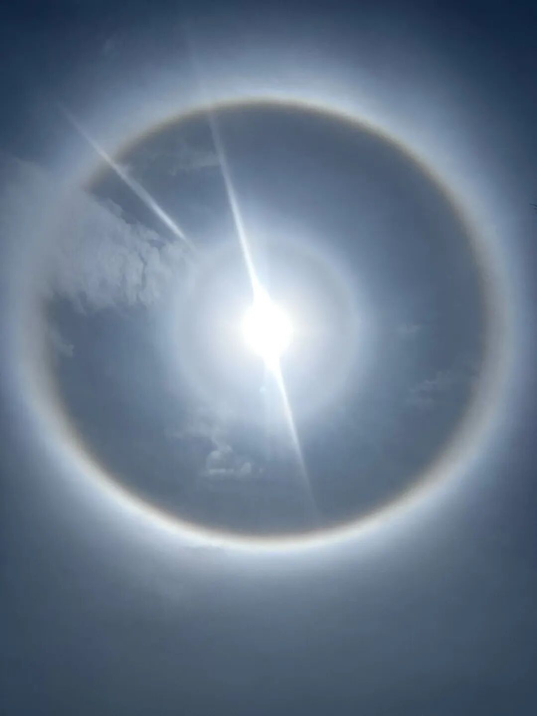 日晕半径的视角通常是22度和46度,通常可以用肉眼观察到日晕现象。云层中冰晶含量越大,光环越显著,就越容易被人观察到。