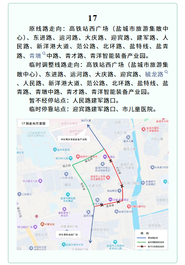 因建军路(解放路至人民路)道路封闭施工,自2026年4月16日起,公交17路临时改道行驶,具体如下: