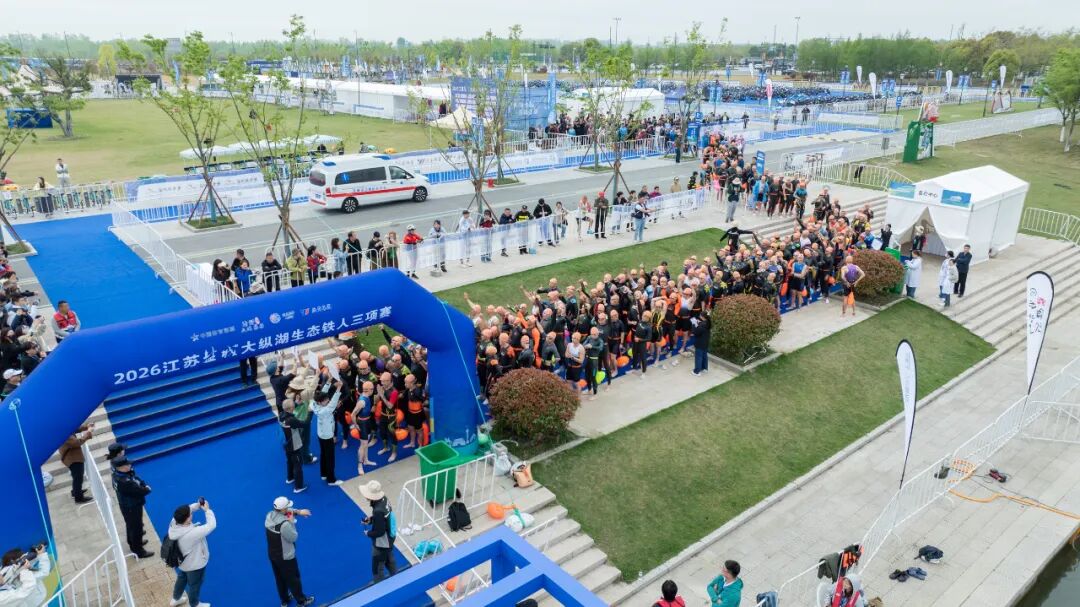 4月19日,盐都区蟒蛇河未来水世界主舞台人潮涌动,晨光穿透云层,与现场热情交织,为2026江苏盐城大纵湖生态铁人三项赛拉开序幕。