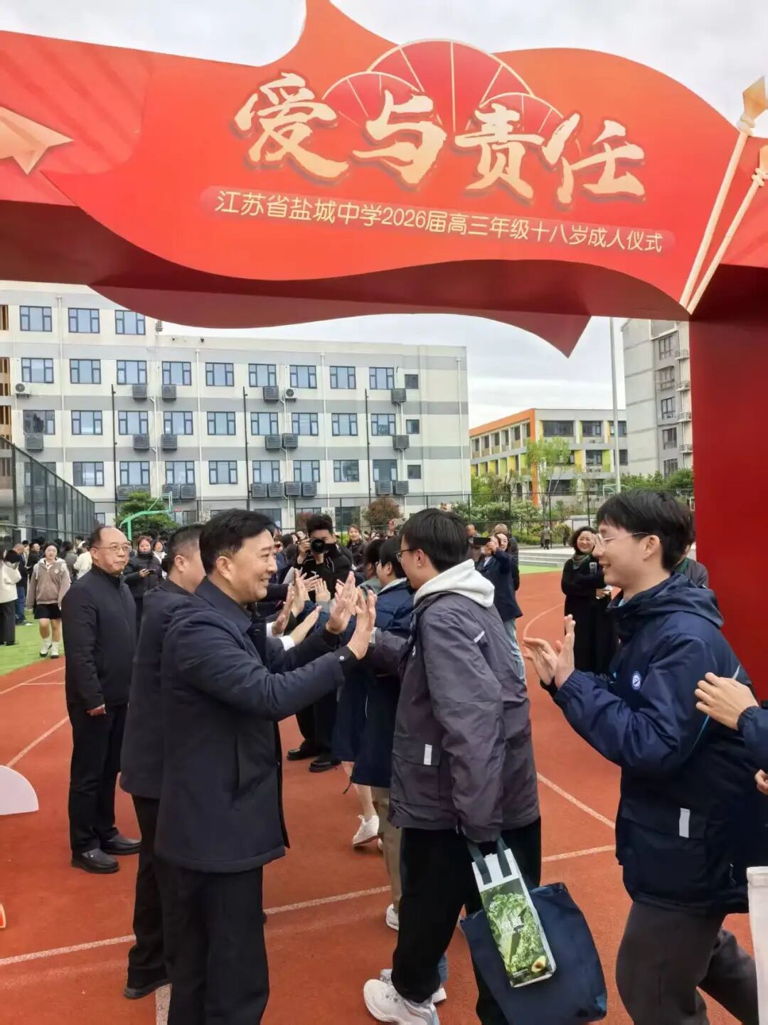 仪式最后,全体高三学子列队依次穿过“成人门”。师长、家长代表等分列两侧,与每一位学生击掌鼓劲,送上最真挚的祝福。掌声、笑声、鼓励声交织在一起,成为这个春日午后最动人的旋律。