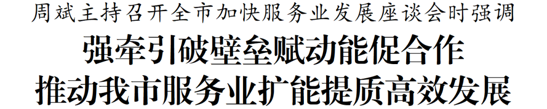 4月21日,市委书记周斌主持召开全市加快服务业发展座谈会。他强调,要深入学习贯彻习近平总书记就服务业发展作出的重要指示和对江苏工作重要讲话精神,全面落实全国服务业大会部署,提振信心做强自身,政企同心同向发力,进一步强牵引、破壁垒、赋动能、促合作,全力推动我市服务业优质高效发展。