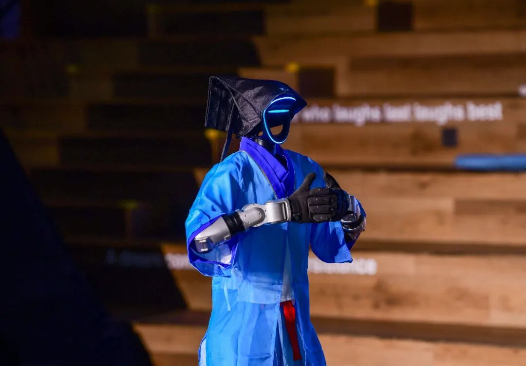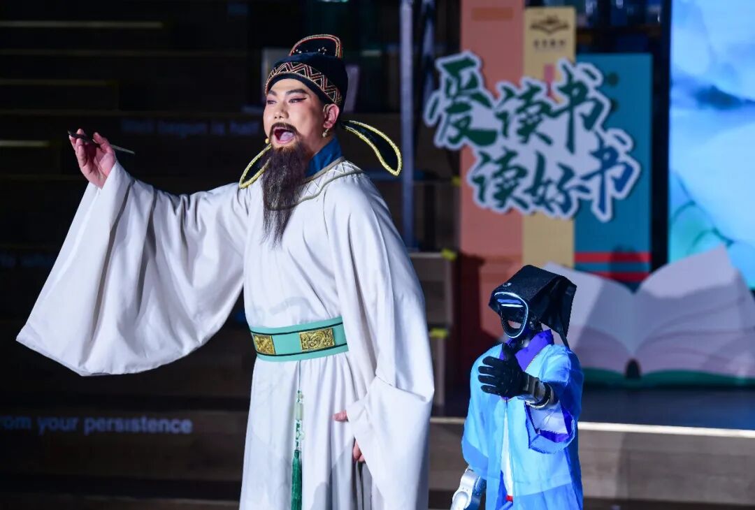活动一大亮点当数创意跨界节目《机器人学艺记》。来自盐城市数字视听梦工厂的AI机器人向江苏省淮剧团的淮剧演员“拜师学艺”,以淮调传唱《岳阳楼记》,在一教一学、一唱一和中,让传统非遗淮剧与现代科技奇妙碰撞。经典名句以沉浸式演绎,既传递了“先天下之忧而忧,后天下之乐而乐”的家国情怀,又展现出非遗不老、经典常新的鲜活生命力,成为全场极具新意与看点的环节。