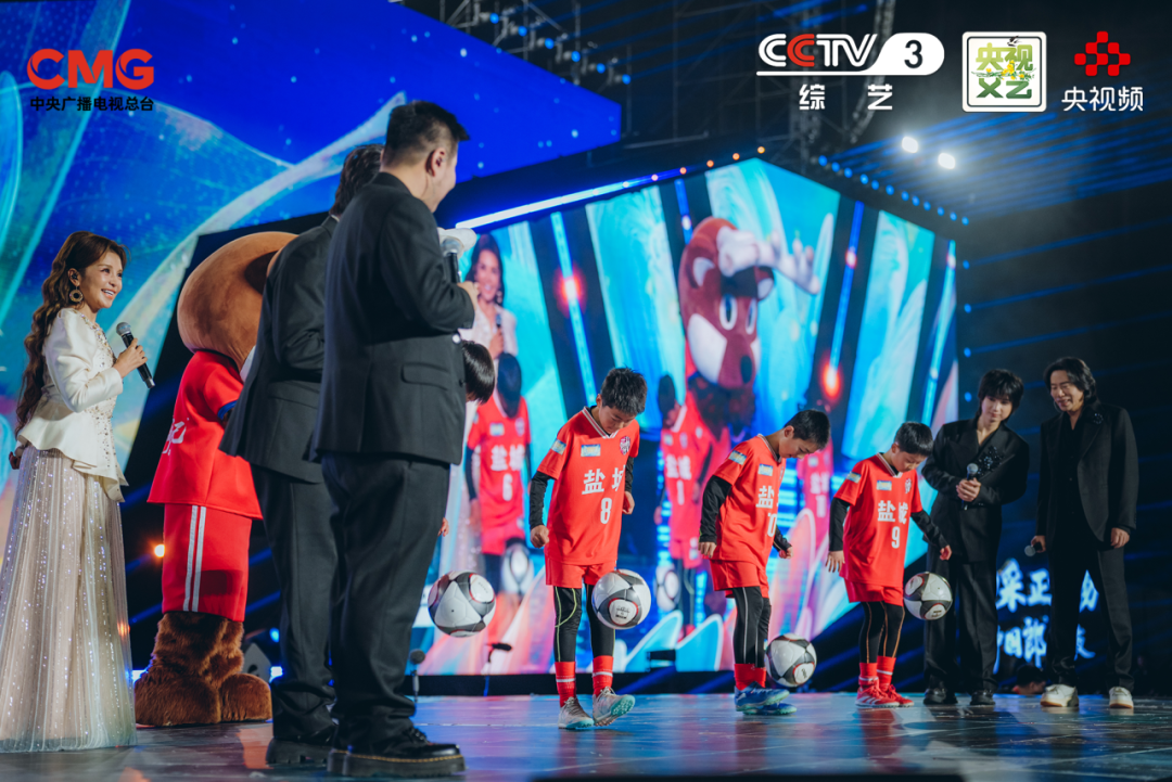 当《在他乡》的前奏响起,水木年华的于盛拿起话筒,用一口地道的滨海话向乡亲们问候:“盐城的朋友们,大家好!”短短一句,台下响起潮水般的掌声。随后他们还和盐城足球小将们玩起了足球游戏,见证盐城足球未来。