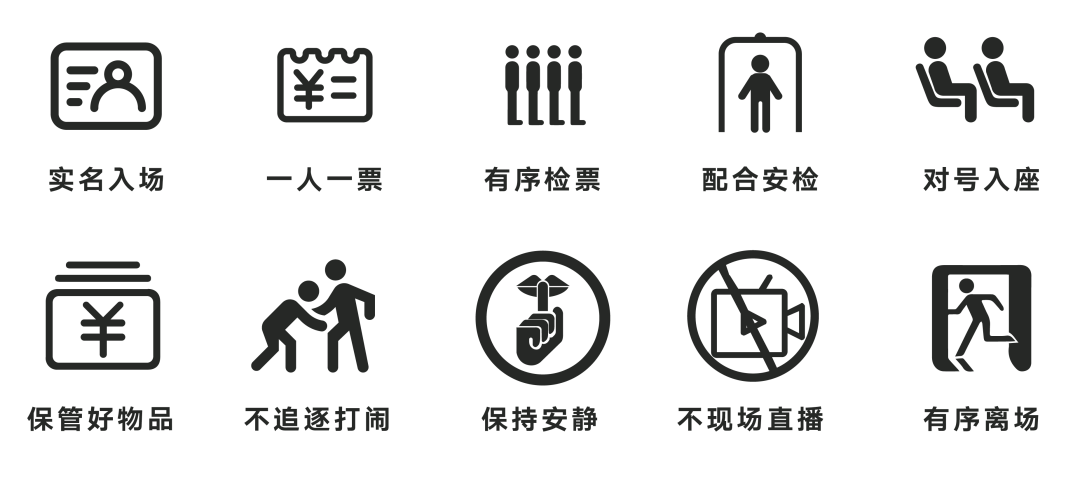 一、入场观赛时请务必携带本人身份证原件、电子票夹,“人、票、证”合一。核验人脸实名入场(一人一票,转赠无效)。无票人员禁止入场,扰乱现场秩序,依法处理。