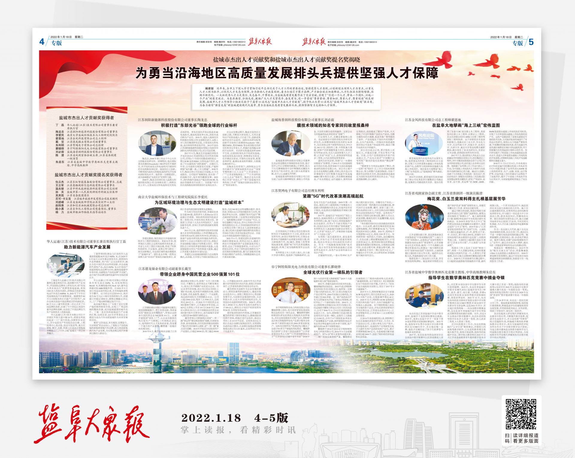 编者按 近年来,全市上下深入学习贯彻习近平总书记关于人才工作的重要论述,坚持党管人才原则,以创新创业领军人才为重点,以重大人才工程为抓手,以优化人才生态为保障,全力推动人才政策创新,着力打造引才聚才品牌,产才融合效应加速释放,人才队伍活力持续增强、结构不断优化。一大批优秀人才立足岗位、矢志奋斗、干事创业,为盐城高质量发展作出了突出贡献,实现了“引进一个人才、带来一个团队、兴起一个产业”的裂变效应。为表彰典型、弘扬先进,激励广大人才见贤思齐、奋发有为,进一步营造“尊重劳动、尊重知识、尊重人才、尊重创造”的良好氛围,盐城市人才工作领导小组决定授予丁磊等10名同志“盐城市杰出人才贡献奖”,授予仇云杰等10名同志“盐城市杰出人才贡献奖”提名奖,为奋力谱写“强富美高”新盐城建设现代化篇章、勇当沿海地区高质量发展排头兵,提供坚强智力支持和人才保障。