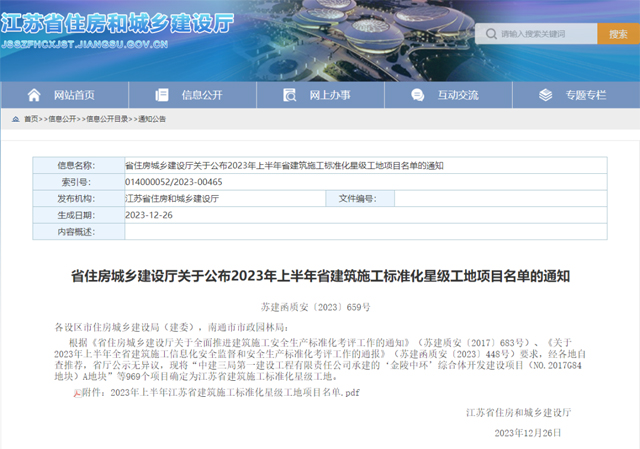“江苏省建筑施工标准化星级工地”是全省建筑工程安全文明施工最高奖项,奖项评选需要对参评工程扬尘防治、起重机械、安全管理、平安创建、文明施工等内容进行综合评测打分,获奖工程代表了全省安全文明施工的先进水平。