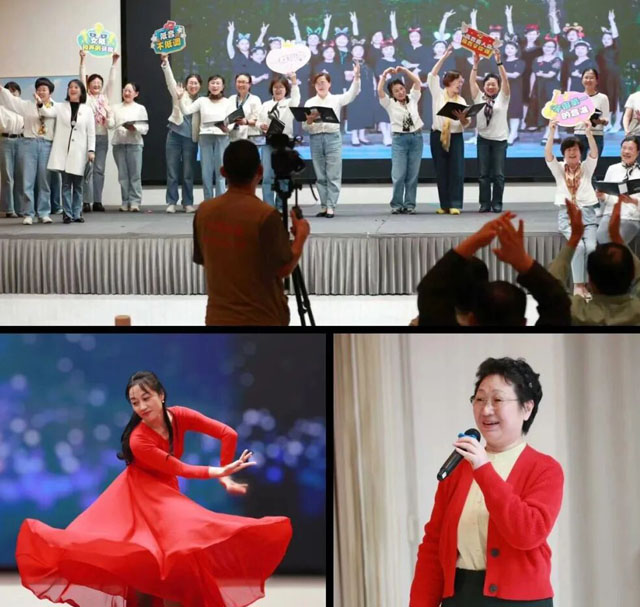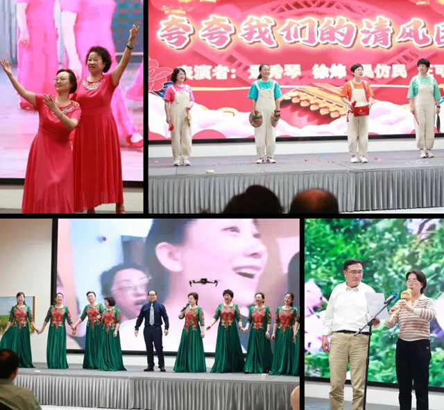 张利平、王平的朗诵,张爱民、袁英的对唱,潘晓东、邹冬梅、陈海鸿等人的独唱,沈庄英、胡世娟的双人舞,成守宇、李萍的歌伴舞,丁易的英语民谣和金善子的韩语金曲,顾牡丹的古琴弹奏和马君的葫芦丝吹奏,男低声部的小合唱和女低声部的三重唱……节目精彩纷呈,令人目不暇接。